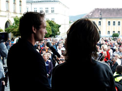 Fotoreportáž: Varnsdorfské posezeníVarnsdorf, 18.9.2011 0:43, (ROMEA) Zhruba 400 až 500 lidí se dnes odpoledne zúčastnila demonstrace pořádané Lukášem Kohoutem na varnsdorfském náměstí. Vedle plápolání hned několika vlajek České republiky doplněného o opakové zpívání státní hymny zaznělo i cinkání klíčů jako symbol snahy o přimění varnsdorfské radnice k demisi. Demonstrace pokračovala poměrně poklidným pochodem k romské ubytovně Sport, kde ale demonstrantům přehradila cestu policejní auta s těžkooděnci. Ti je dále nepustili i přes snahu Lukáše Kohouta prohlásit pochod za náboženské procesí, pro jehož vedení byl vybrán údajný ministrant římskokatolické církve, jinak agilní člen neonacistické scény Jiří Engelhart. Proto se dav později prodral několika postranními uličkami k druhé ubytovně v ulici T. G. Masaryka. celý článek